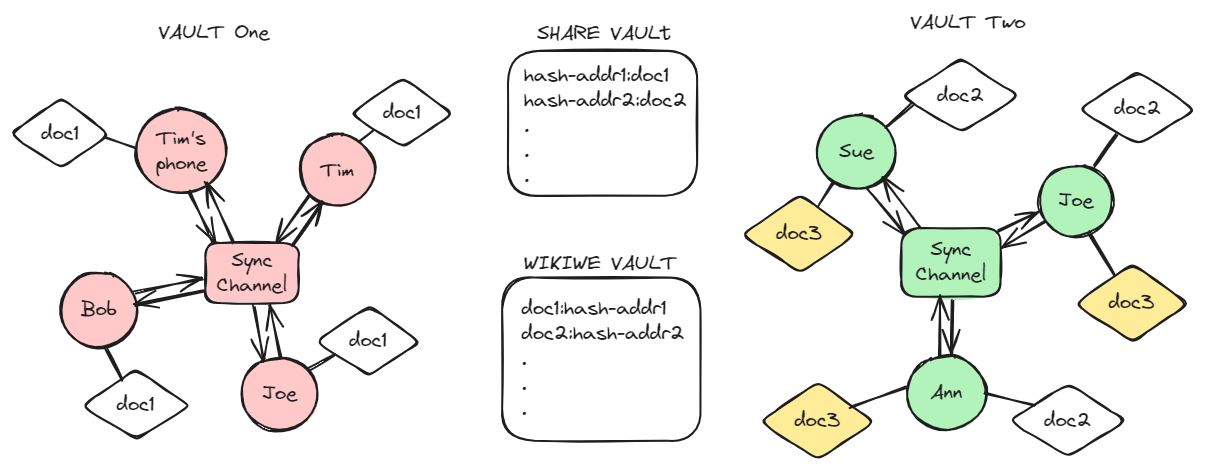 Every device synced via the designated Sync Channel2 contains an identical copy of the synced document. For example, every device in Vault One contains a copy of “doc1” and every device in Vault Two contains a copy of “doc2”and “doc3.” Someone belonging to Vault One registers a “hash-address” of doc1 in the WikiWe Vault, and stores an encrypted copy under the hash-address in the Share Vault. The hash-address is a combination of a fingerprint hash of doc1 and a storage address, expressed in the same value or in multiple values. Someone belonging to Vault Two similarly registers a hash-address of doc2 and stores an encrypted copy in the Share Vault. Doc3 is not registered and is accessible only by the members of Vault Two.