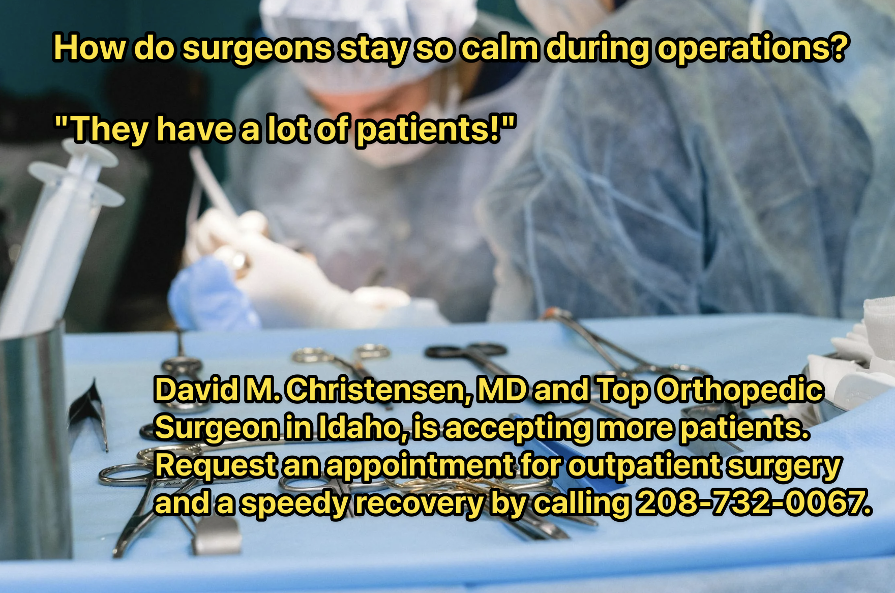 David M. Christensen, MD and Top Orthopedic Surgeon in Idaho is accepting more patients. Request an appointment for outpatient surgery and a speedy recovery by calling 208-732-0067.