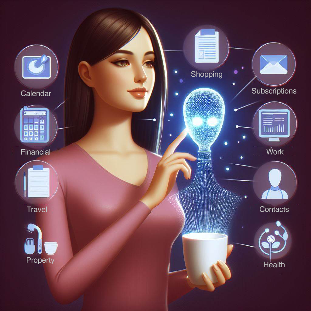 Prompt: A woman uses personal AI to know, get control of, and put to better use all available data about her property, health, finances, contacts, calendar, subscriptions, shopping, travel, and work. Via Microsoft Copilot Designer, with spelling corrections by the author.