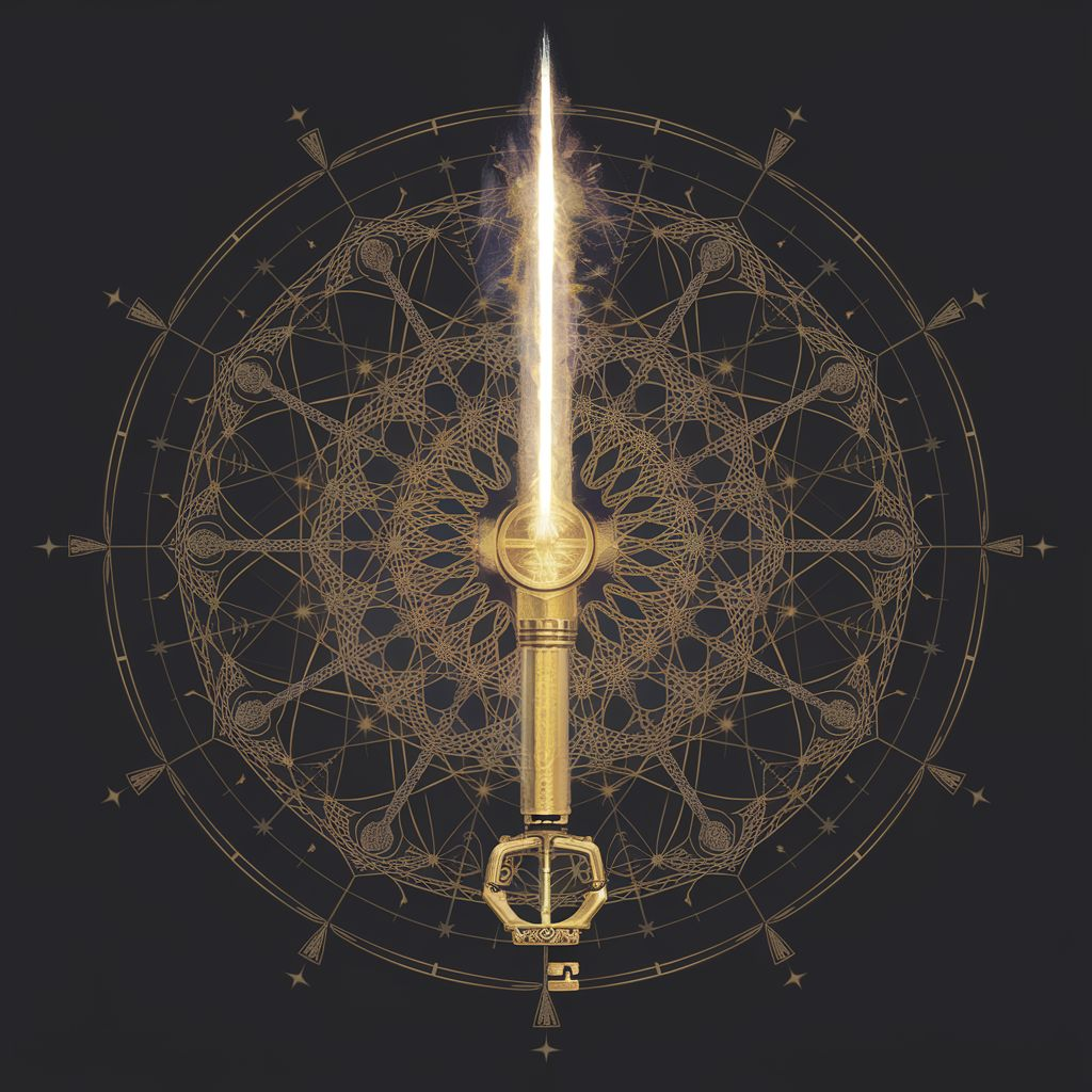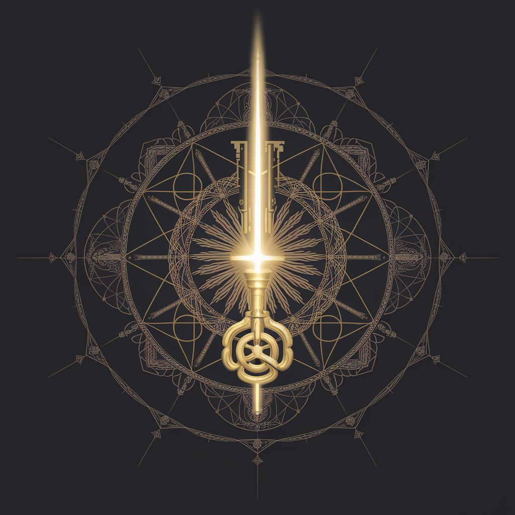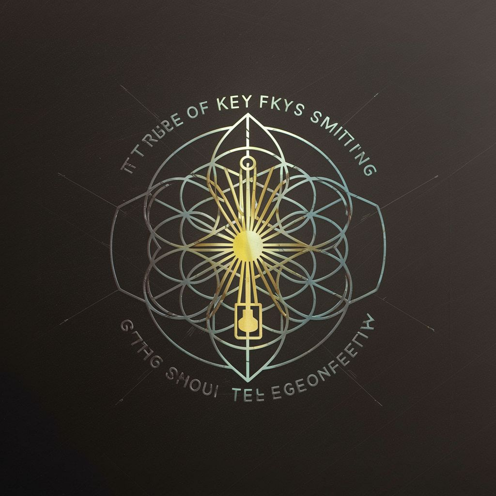 “Create a minimalist logo that represents a tribe of key smiths dedicated to sacred geometry. The design should feature a stylized key or lock to symbolize the craft of key smithing, integrated with elements of sacred geometry such as the Flower of Life or Metatron’s Cube. At the center, depict a radiant beam of light that signifies the tribe’s focus on gathering energy. Incorporate clean lines and a limited color palette with metallic tones and bright accents to convey the mystical and energetic nature of the tribe. The logo should be simple yet powerful, capturing the tribe’s essence without excessive detail.”