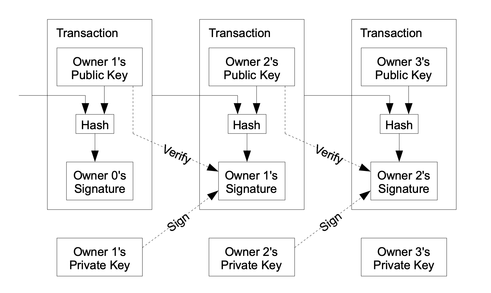 We define an electronic coin as a chain of digital signatures. Each owner transfers the coin to the next by digitally signing a hash of the previous transaction and the public key of the next owner and adding these to the end of the coin. A payee can verify the signatures to verify the chain of ownership.