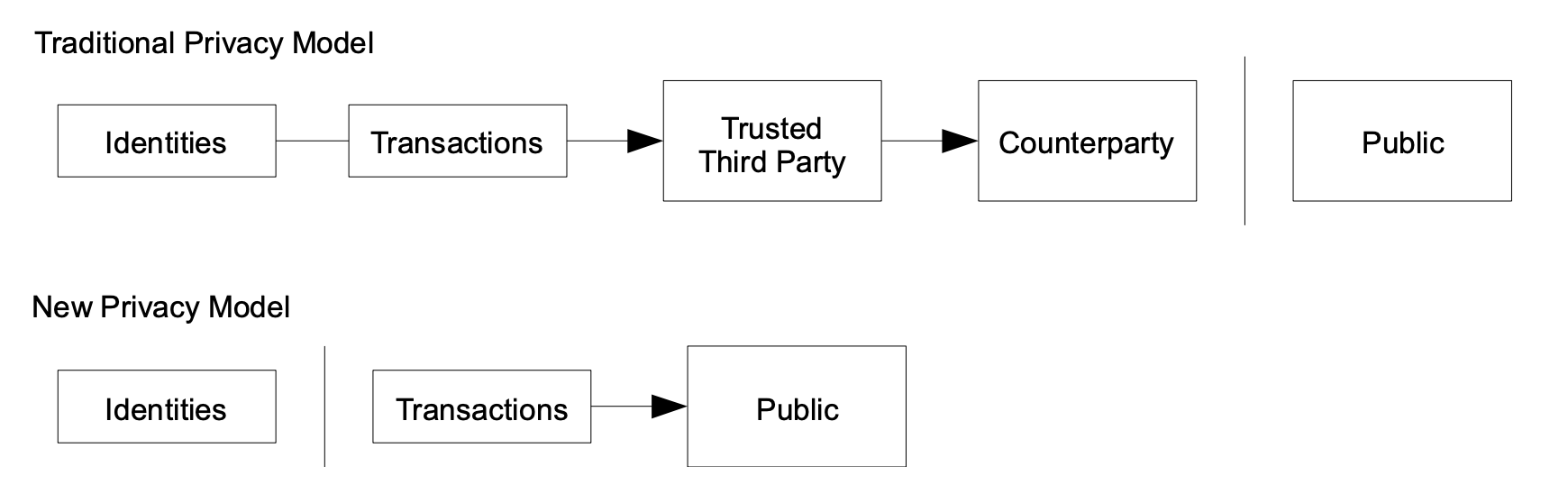 The traditional banking model achieves a level of privacy by limiting access to information to the parties involved and the trusted third party. The necessity to announce all transactions publicly precludes this method, but privacy can still be maintained by breaking the flow of information in another place: by keeping public keys anonymous. The public can see that someone is sending an amount to someone else, but without information linking the transaction to anyone. This is similar to the level of information released by stock exchanges, where the time and size of individual trades, the “tape”, is made public, but without telling who the parties were.
