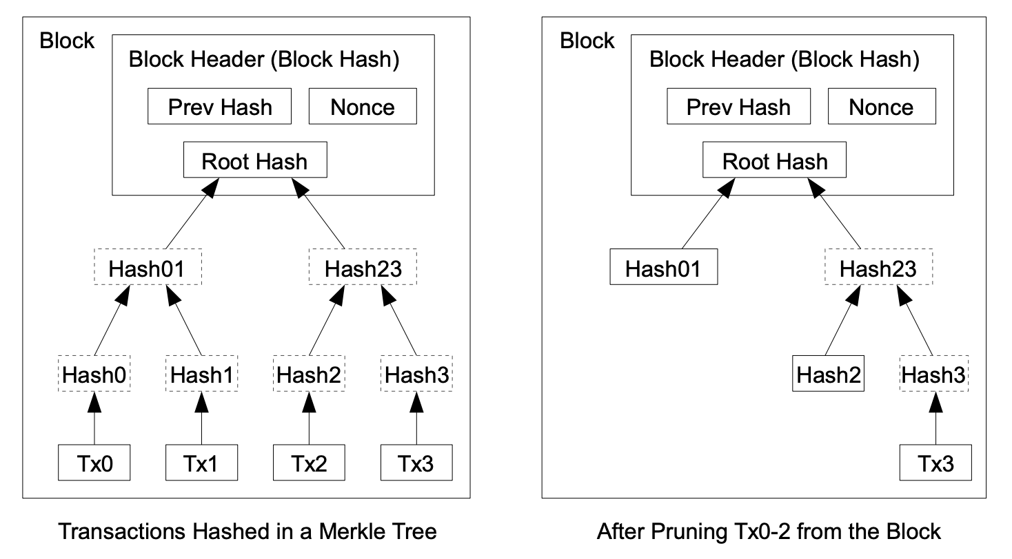 Once the latest transaction in a coin is buried under enough blocks, the spent transactions before it can be discarded to save disk space. To facilitate this without breaking the block’s hash, transactions are hashed in a Merkle Tree 345, with only the root included in the block’s hash. Old blocks can then be compacted by stubbing off branches of the tree. The interior hashes do not need to be stored.